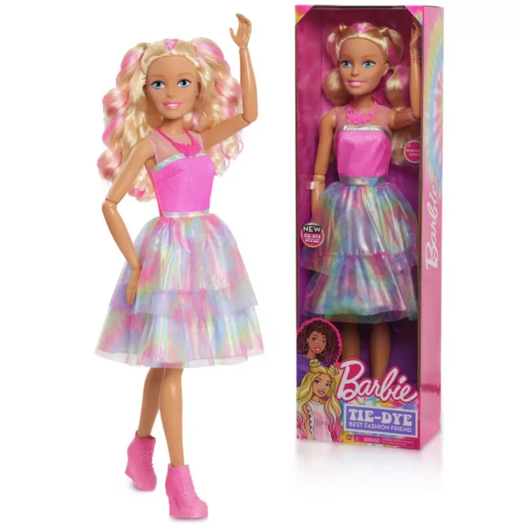 Standing over two feet tall, Barbie has never looked more beautiful or stylish. The Barbie 28-Inch Best Fashion Friend Doll comes dressed in trendy fashion featuring beautiful textures and fabrics. Barbie looks stunning in her dress featuring a sparkling pink bodice, shimmering metallic and tie-dye tulle layered skirt, and removable pink shoes. Featuring her long blonde hair highlighted with pink streaks and tinsel. Barbie is articulated in her arms and can be moved into fun poses. Collect Barbie in all her many styles for a fabulously fun time.