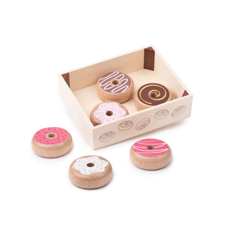 Tuck into a delicious crate of wooden doughnuts! A yummy addition to any toy food kitchen, our doughnut wooden play food is perfect for sharing! Helps with fostering imaginative play and builds social and language skills.