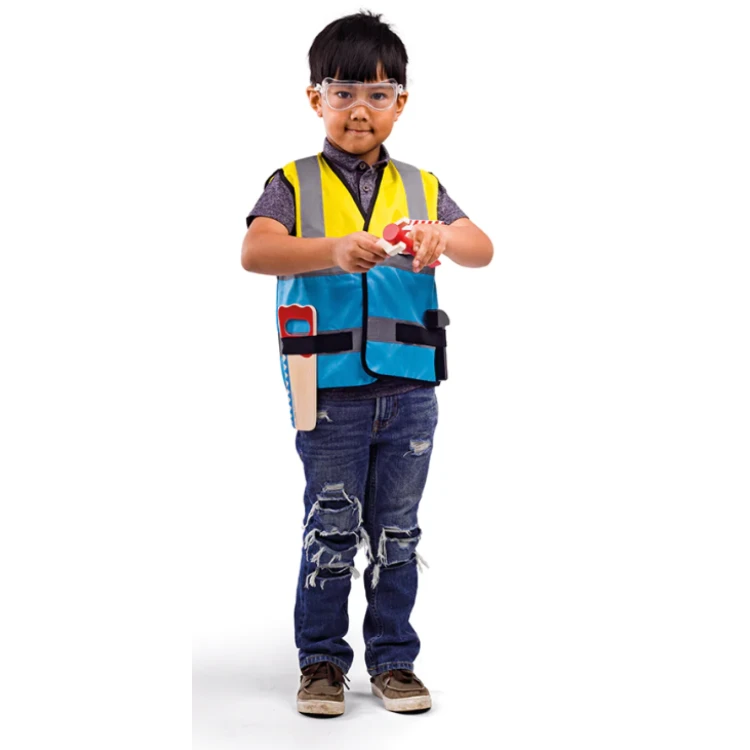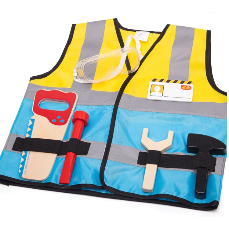 - Builder dress up set with a fluorescent yellow and blue jacket, wooden saw, screwdriver, wrench, hammer, safety goggles and ID badge