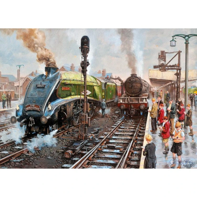 The Norseman at Doncaster; the London Kings Cross to Newcastle express, connects with shipping services to Norway. This 1000 piece puzzle, painted by the talented David Noble, takes us back to 1961 when the Gresley A4 No. 60025 ‘Falcon’ stops to replenish its tender alongside V2 2-6-2 No. 60952.Â