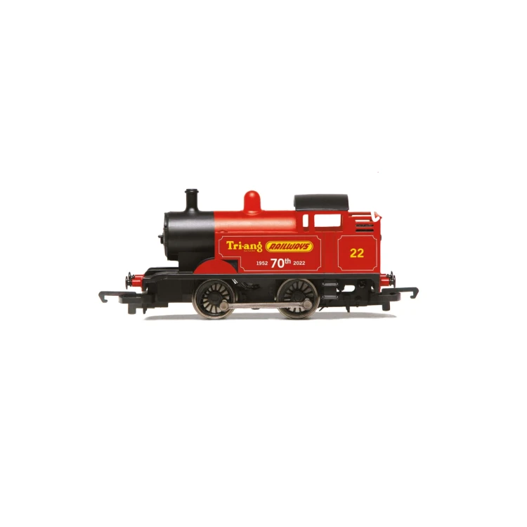 The 2022 Hornby Collector Club locomotive celebrates two special anniversaries – the 70th anniversary of Tri-ang Railways and the 50th anniversary of Hornby Railways. Each anniversary is promoted on either side of the 0-4-0 locomotive.