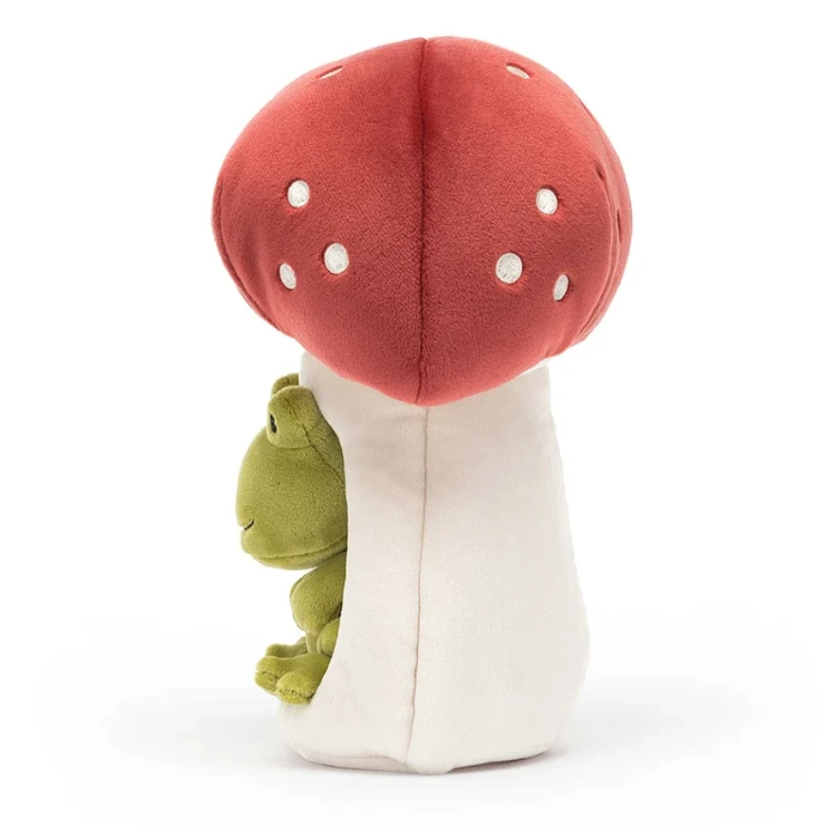 Forest Fauna Frog was excited to find such a fine scarlet toadstool! With a sturdy suedey stalk and squishy cranberry cap, it’s just the spot to curl up for a snooze. This stretch mossy sweetie bounced out of the pond to claim this speckled nook all for themselves!