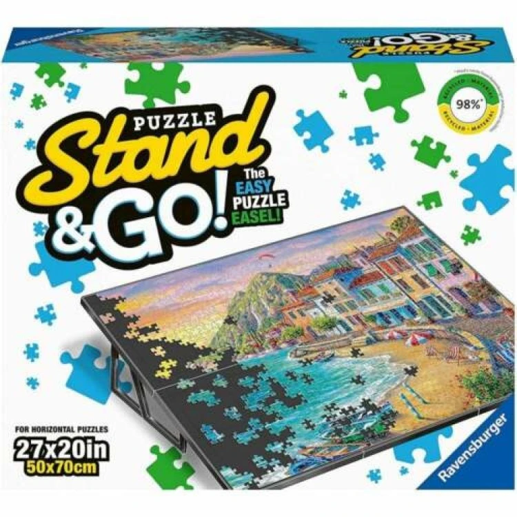 This simple-to-build click together easel makes puzzling more comfortable. The gently angled non-slip surface reduces the amount of stretching required to reach the top of the jigsaw, helping you to avoid strain as you puzzle the day away. The puzzle board is built from 6 connecting panels which sit on 4 angled legs. The puzzle platform is suitable for most landscape puzzles up to 70 x 50cm. Made from 98% recycled plastic. Full assembly instructions on box base. Supplied with 6 non-slip panels, 4 angled legs, and 14 joining pegs. Puzzle not included.
